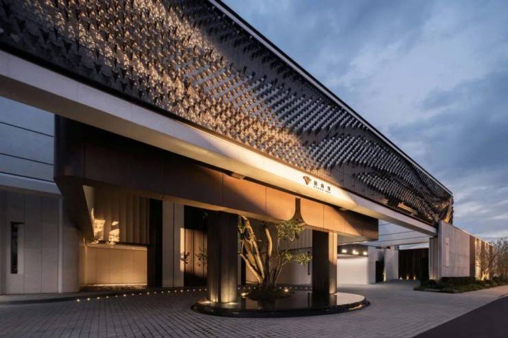豪宅需要至繁至简、历久弥新的永恒美学,空间的稳定和秩序需要强大的体量感去营造,因此我们立面体系的营造上,选用温润如玉的月光米黄石材和锻打锤纹的紫铜做对比,彰显厚重典雅的视觉美感,突出温润高贵的挺拔气度。8 米高的手工紫铜照壁和立柱,强有力地撑起空间的体量感和秩序性,建立豪宅封闭的领域气场