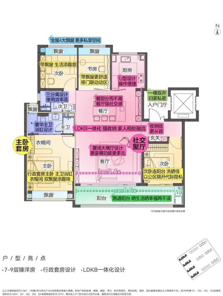 7到9层, 一梯双开,每户门前都拥有独立的入户空间,低密度洋房+私享入户空间,极大提高居住舒适度和私密性。四房两卫+主卧套房设计+主卫带浴缸+5.4米开间客厅+8.6米开间落地窗阳台,既阔绰又实用。