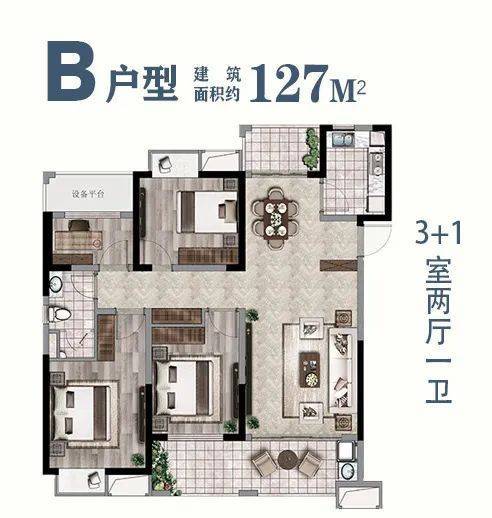 太仓星悦府建面约127m²,阔景四居