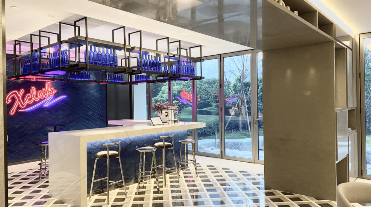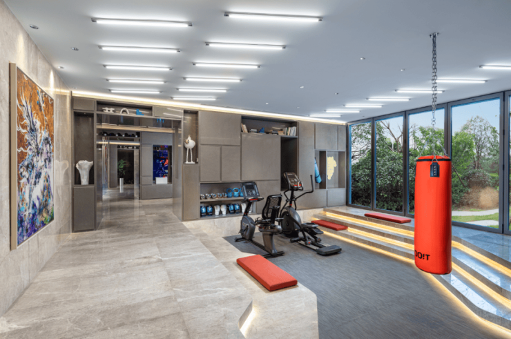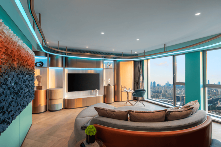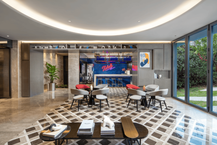 还有吧台、休闲洽谈区、共享会议和健身等功能区,是一个适合交友、会客、休憩、工作、读书、赏景的多功能空间.处处可见的时尚元素,符合当下年轻一代喜好。
