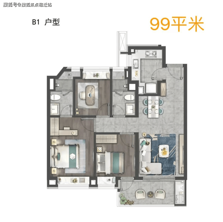 以 99㎡三房两厅两卫户型为例,客餐厅连接景观阳台,采光面更大,为日常生活带来更多舒适感,双卫设计更为生活增添便利。105㎡三房两厅两卫户型,客餐厅与阳台一脉相连,居住空间感进一步扩大,约 5.1 米的宽厅,无论是日常休憩还是会客,都尽显大方得体。此外,项目中央空调、地暖、新风三大件配套齐全,且臻选大金等同级品牌空调地暖、老板和方太等同级品牌厨房配备、摩恩、弗兰卡、科勒等同级品牌卫浴配备 ,每一处细节都彰显着对居者的用心,为您打造高品质的居住环境。