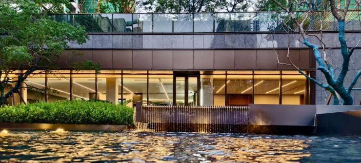 入户大门使用普拉达绿和温德姆灰石材、金属和玻璃,这种设计属于具有普适性的“老钱风”。