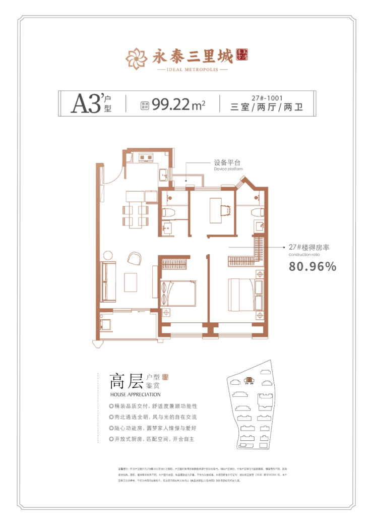 项目主推建面约100㎡左右,三个主力户型布局非常相似,都是功能性和尺度感完美结合的明星户型。