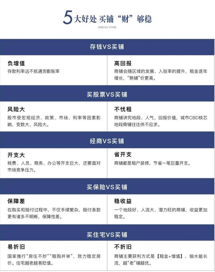 综上所述,相比存钱、买股票、经商、买保险和住宅,买一间地段好、人流大、潜力旺的商铺,风险小收益稳省心又省力。
