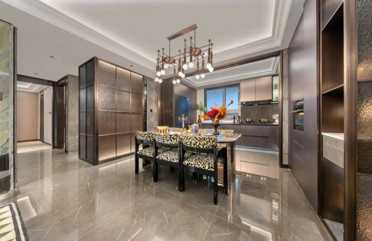 门扇部位以陶瓷镶嵌铜丝工艺,配纯手工掐丝珐琅贴片的精制拼贴,不喧宾夺主的同时又自带低调的冲击力,用通透沉稳给室内空间定了调。