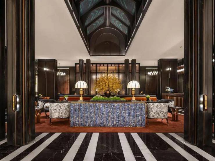 矗立两旁的是进口奢石巴西乌金石打造的大理石柱,庄重典雅。点缀画面中央的是玻利维亚蓝,这是世界上储存量极少的石材之一,被称为奢石中的劳斯莱斯。地面的拼花灵感来自伦敦瑰丽酒店,黑白相间,给我一种神秘厚重的感觉。