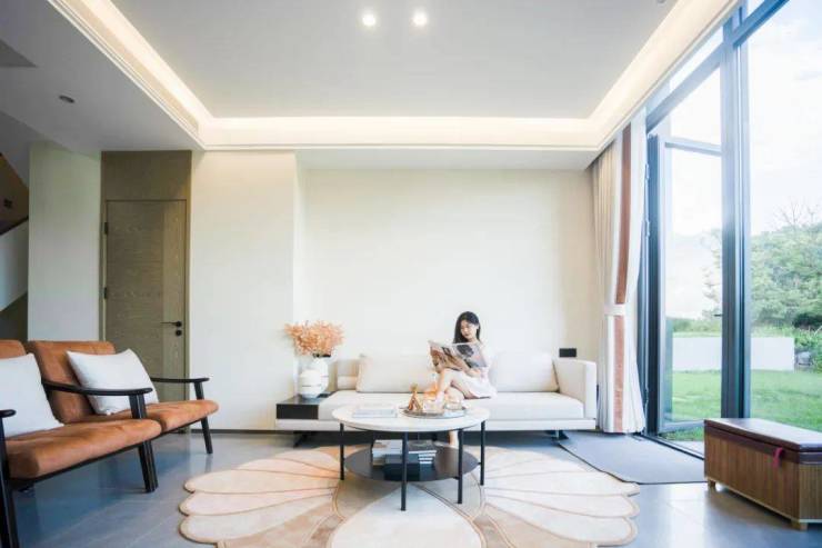 远处望去,轻盈玻璃+质感灰的立面组合,倒映着天光和云影,让建筑成为跃动在湖山间的音符;步入院墅内,超大观景阳台+通透落地窗的细节设计,形成一个“超级光屏”空间,让自然光影的故事于室内不间断上演,每一天的日常也随之愈发生动鲜活。