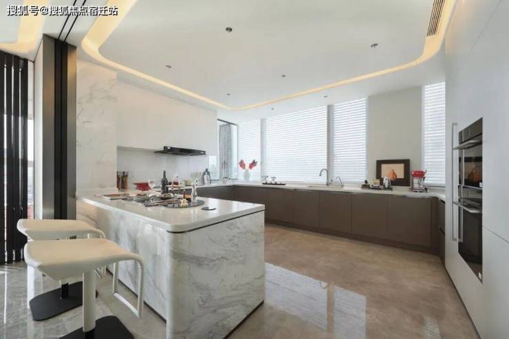 厨房设计也很别致,约5米宽的无柱转角大玻璃将运河景观最大化引景入室,跟阳台间也是透明的,妈妈下厨还能跟孩子们有视线上的交流,关键是通透的采光让每次烹饪都有愉悦的心情。