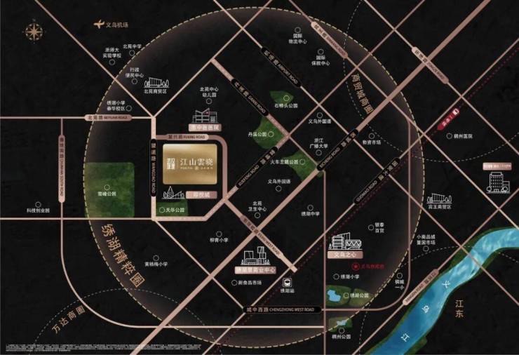 项目择址于绣湖精粹圈,坐拥世界义商起源,立足义乌中心位置,在四大商圈中价值居首,成为商圈矩阵的核芯,最大化掌握城市核心资源。除此之外,绣湖商圈是义乌城脉、商脉、文脉的发源地和向心地,拥有行政、商业、教育等城市重要坐标。项目周边直径约 2 公里范围内汇聚了义乌 TOP 级的配套资源,交通畅联城心内外、地标型商圈环伺、教育资源荟萃、公园景观叠翠,使得信息、资源、生活在这里高效交互。