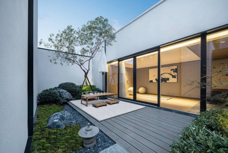 取古典山水意境,融合到设计的体块、比例、色调之间,通过现代工法将材质合自然院落意境融为一体。
