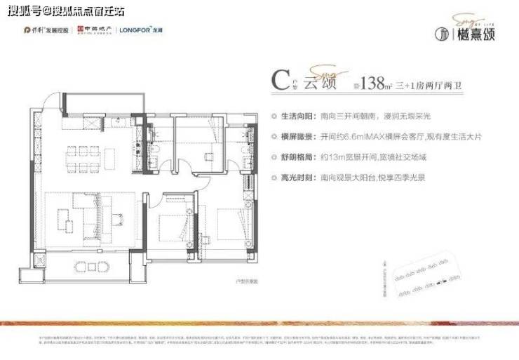 建面约138㎡整体3+1房+南向三开间+双卫的格局设计,更是让这个户型自带尺度感、舒适度、尊崇感。
