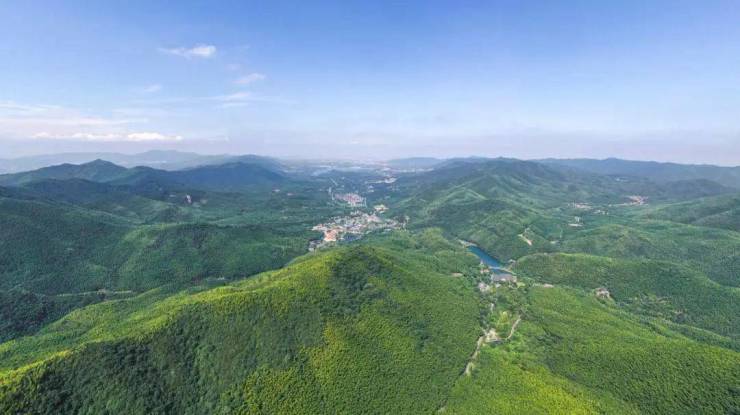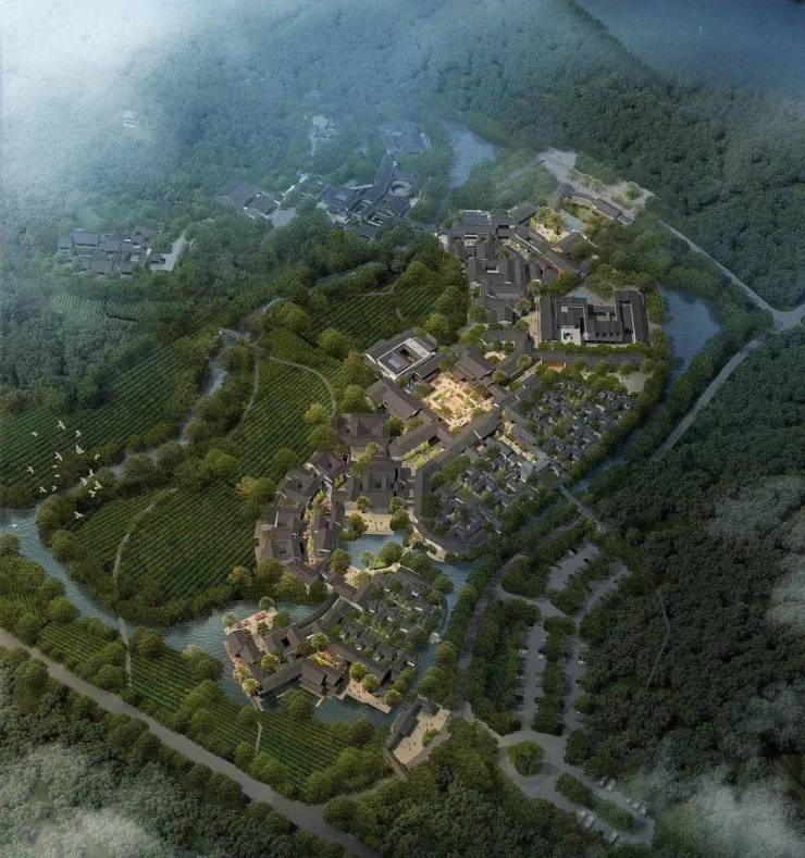 从空中俯瞰,整座小镇中心白墙黛瓦、错落起伏,远与山水相依,近有溪流环绕,周围茶田、竹林密布,形成一幅精致婉约的江南画卷。