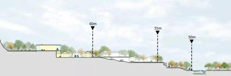 设计师以湖岸、溪谷、茶田、花海搭起的地景结构线,串联起小镇中心、书院以及颐养居住等一系列功能; 山地建筑群遵循丘陵起伏、依坡而建 ,形成阶梯式的建筑形态,屋顶层层跌落,消解了建筑的体量感;基地内原有的茶田被保留下来,设计师将茶田作为功能区域的天然的边界,并由此展开新的建造。