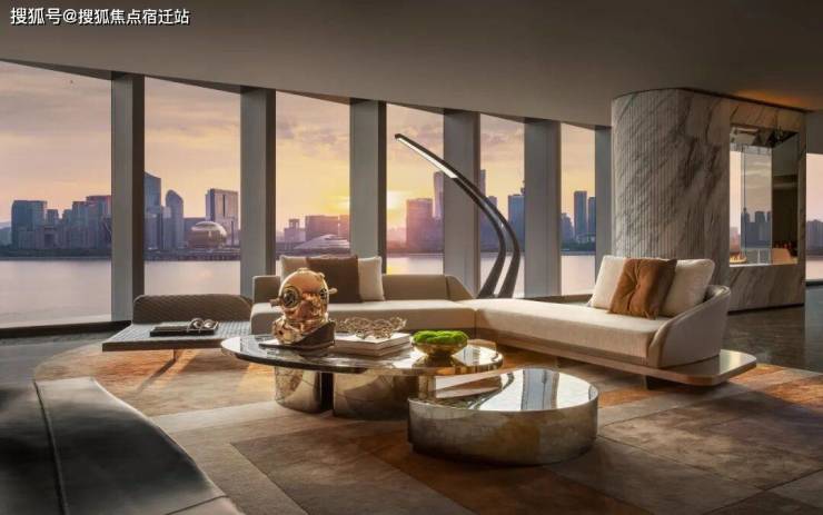 在观雲钱塘面积725m²的平层空间作品中,公共区域被尽可能地“打开”,贯通的玄关、客厅、厨房、餐厅与书房展现出非凡的尺度。近30米的横向景观面将270°江景邀入室内。空间设计由郑忠操刀。