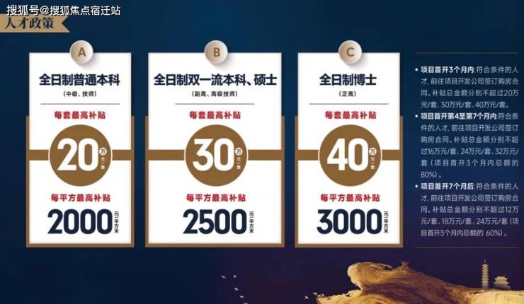 ✧ 全日制普通本科/中级、技师:补贴 2000元/平方米;最高补贴20万元/套。