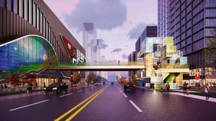 商业MALL采用超现代主义建筑设计风格,以时尚现代曲线铝板和玻璃组合为整体造型基调,顶部扩大曲线天幕遮阳造型,出入口增设超大LED屏幕,同时增加IP, 凸显时尚标志性的立面效果。线性LED灯带嵌入幕墙,夜间形成缤纷的灯光效果。以过街天桥连接商场和街区,加强南北区的交通联系。对商业屋顶设备增加格栅进行美化,提升第五立面效果。