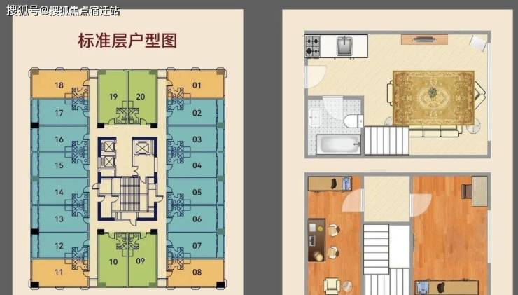 全部为挑高5.3米的MINI LOFT单元。 两栋17层高层,规划为经理人公寓&星级智能写字楼,户型全部 按挑高5.3米设计,主力户型面积46-69平米 之间,可装修成复式小公馆/复式办公房。