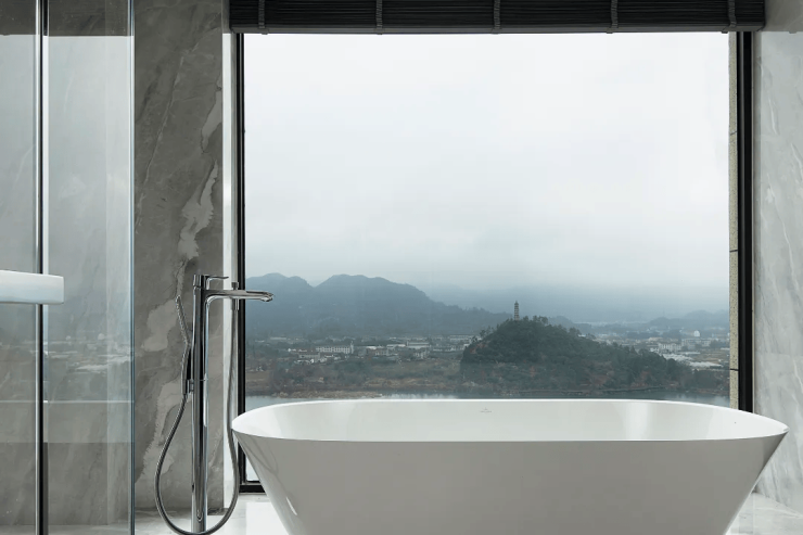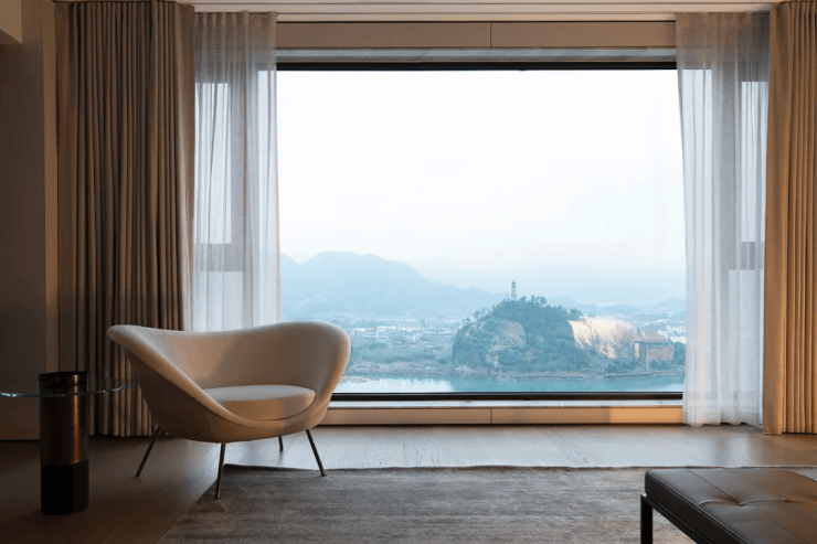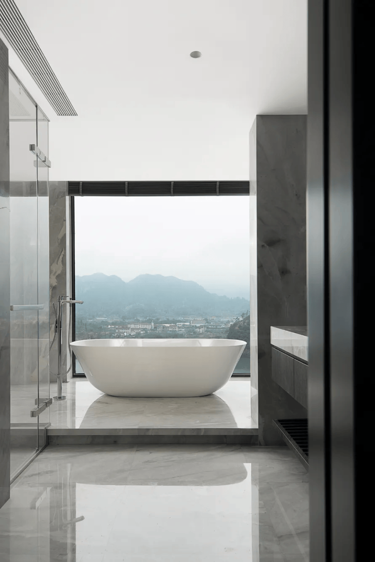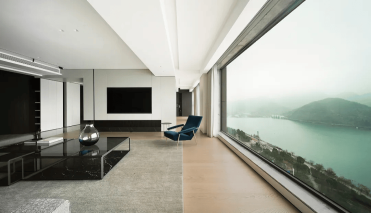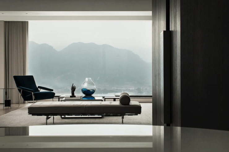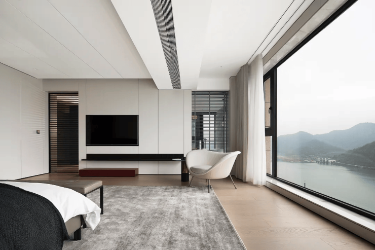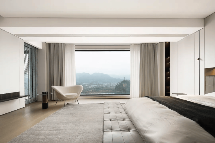 山峰在晨曦的朦胧中,轮廓若隐若现,让人无法抗拒它的美丽。而室内简约的设计风格,与窗外的美景相得益彰,让人无法抗拒这样的组合。