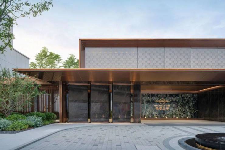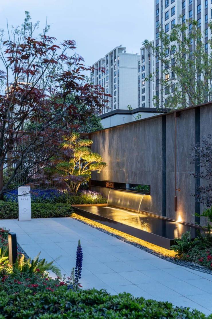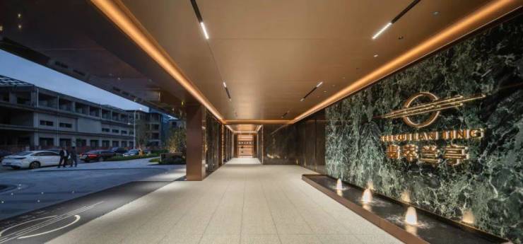 在入口处前场,我们为大堂设计了酒店式落客区;循听水声,目追光影,由此开启归家之路