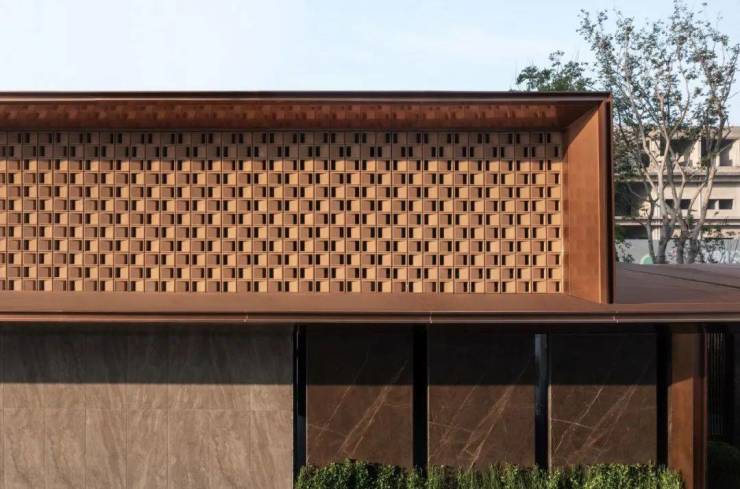 【原质感】在门头二层的格构砖的处理上控制在一毫一厘,提高其细节的精致度。采用香槟色金属线条对格构收边,提高其细节的精致度