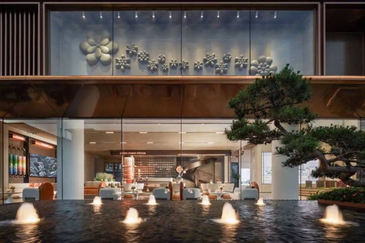 【叠瀑水台】落客环岛采用整石打造叠瀑水台,簇团式涌泉从水台面汩汩而出,整体彰显出酒店优雅气质