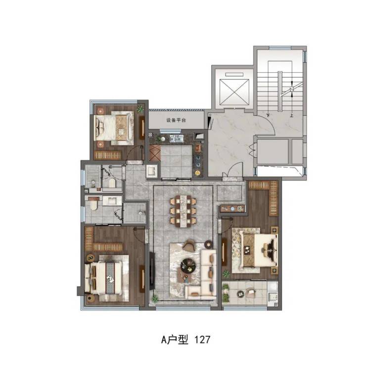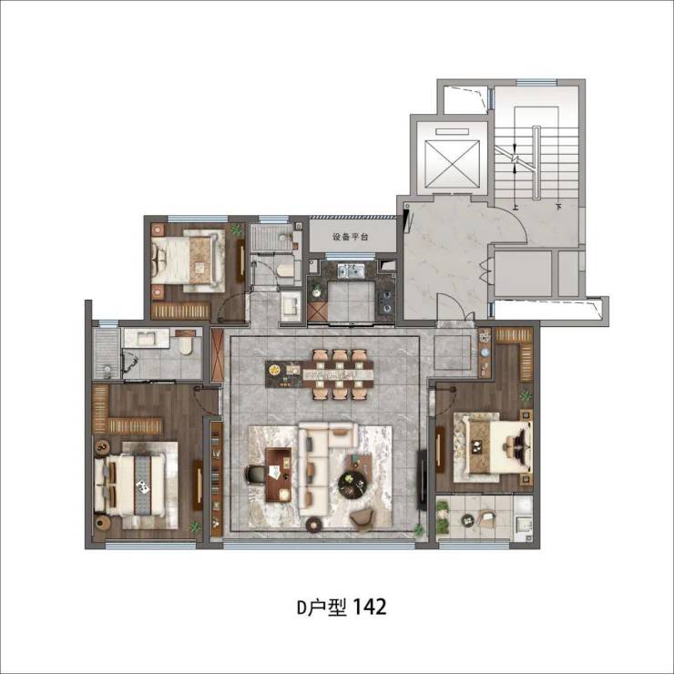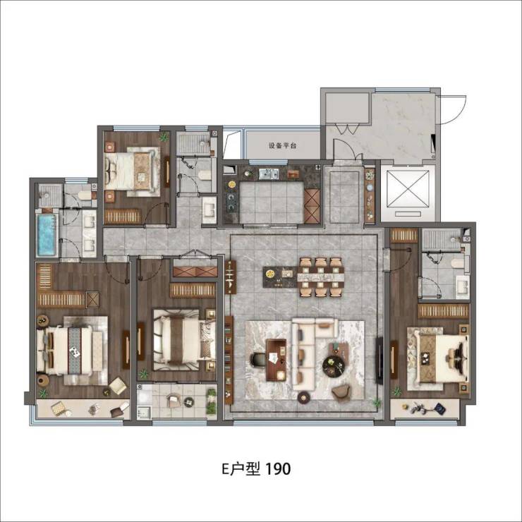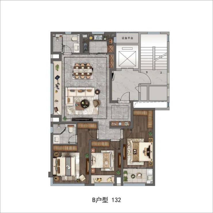 整个户型为横厅设计,餐厅、客厅相连一体,南向约9m的超大面宽,餐客厅相连构成约130㎡的朗阔开间,整体视觉效果会更为开阔。