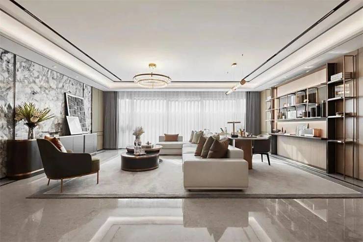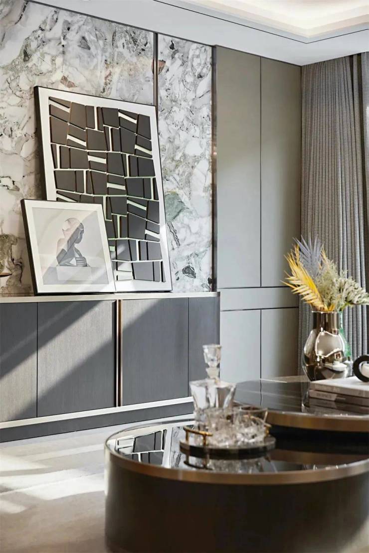 大多以简约的硬装设计为基底,软装采用自带奢华气质的大理石、金属、玻璃、镜面等元素,为空间缔造出丰富的层次感,从而彰显了一种高品质的生活格调。