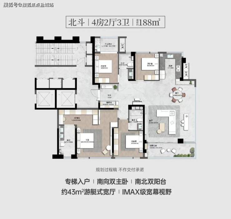 空间设计:188㎡户型采用游艇式端厅(约43㎡)、双主卧套房及IMAX级观景窗,匹配高阶家庭的多场景需求;行政酒廊、恒温泳池等配套则重构了高端生活场景。