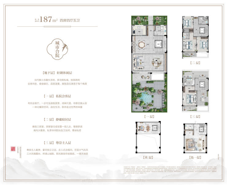 深谙尊贵人居之道,精研建筑面积约187—195㎡城市合院,敬献名门,约5.6米高阔绰地下室空间,开阖之间尽显世家门第之风,重新定义人生大境美好。