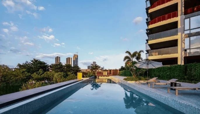 而无边际泳池,则设置在会所的顶部,配备泳池独立餐吧与更衣等功能,为高端买家定制圈层生活。