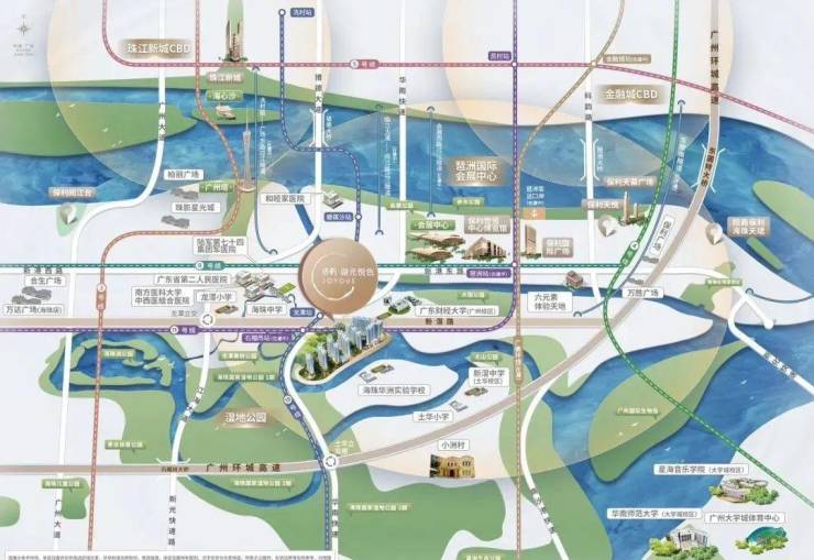 项目坐落于广州中心城区海珠区之心,华洲路旁,西侧为广州海珠湿地公园,南侧邻石榴岗河,距离地铁11号线(在建)和18号线换乘的石榴岗站约1200米,距离琶洲南TOD不到两公里。琶洲,以“会展+总部+数字”为核心的琶洲,与珠江新城、国际金融城三足并立,构成广州CBD“黄金三角”的发展格局,目前琶洲已吸引了阿里巴巴、腾讯、唯品会、今日头条、国美、小米、科大讯飞等一批批企业龙抢滩,肩负着经济再次腾飞的使命