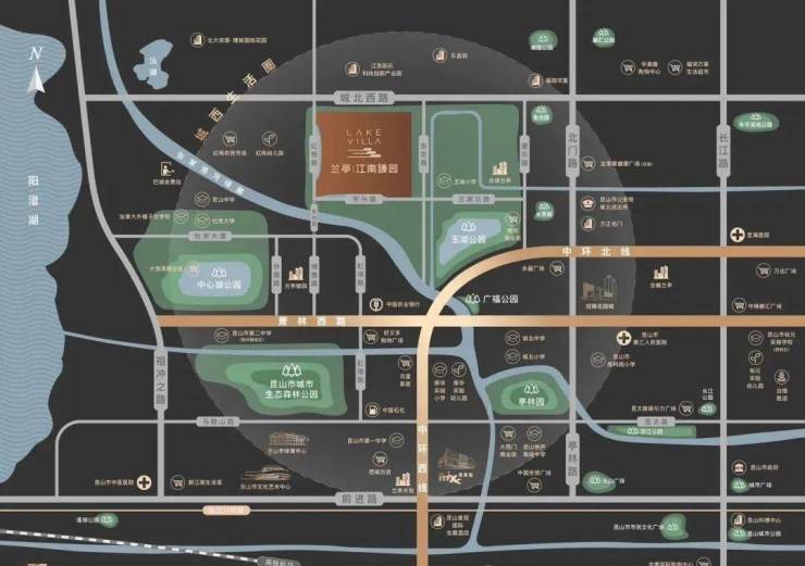 中心湖公园、昆山森林公园、玉湖公园等生态绿境在侧,氧护生活;