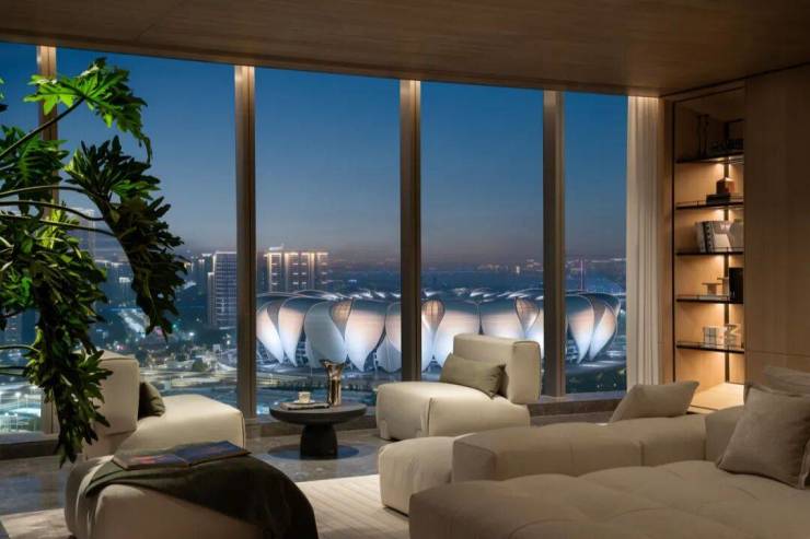 在「潮来RIVA」的20米环幕社交厅,设计师孙文以"留白盛景"的克制笔触,让钱塘江的浩渺与奥体建筑群的璀璨成为空间的主叙事者。云端全景窗如同天然取景框,将大小莲花碗、杭州之门等千亿级地标尽纳眼底。