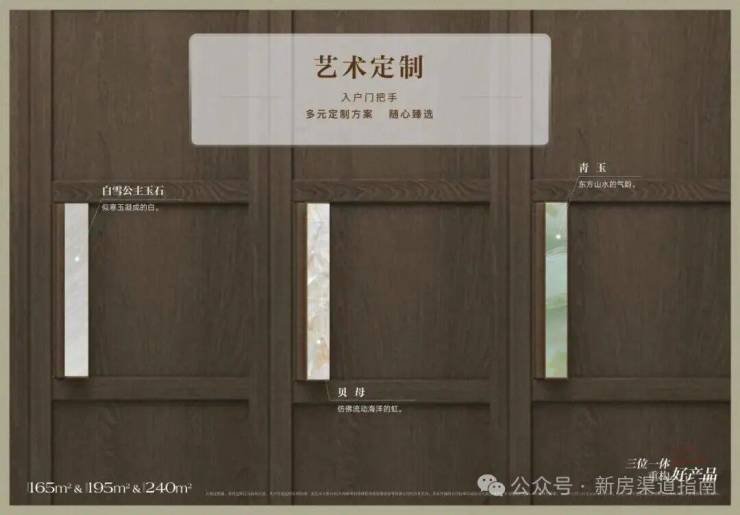 入户门把手提供白雪公主、贝母、青玉三种材质选择;全屋衣柜柜门可选木门或玻璃门。