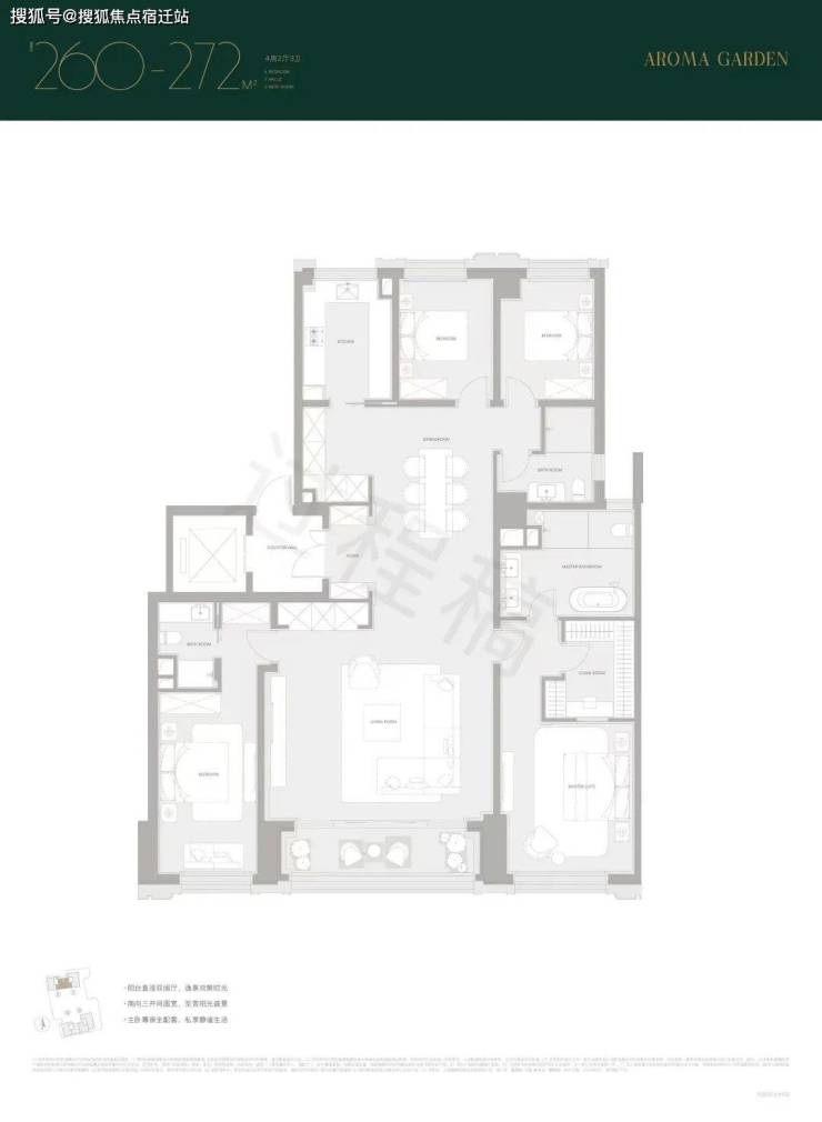 建面约260/272㎡,南向双套房,尤其主卧是豪华套房,带独立衣帽间,卫浴间含双台盆+淋浴+浴缸+马桶四件套。