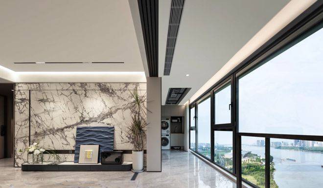 层高约3.15米,进一步拉伸室内空间的框架,墙面组成由肤感护墙板满铺+岩板组成,地面是简一仿大理石通铺地砖,还用的是大尺寸的版本,更显大气!