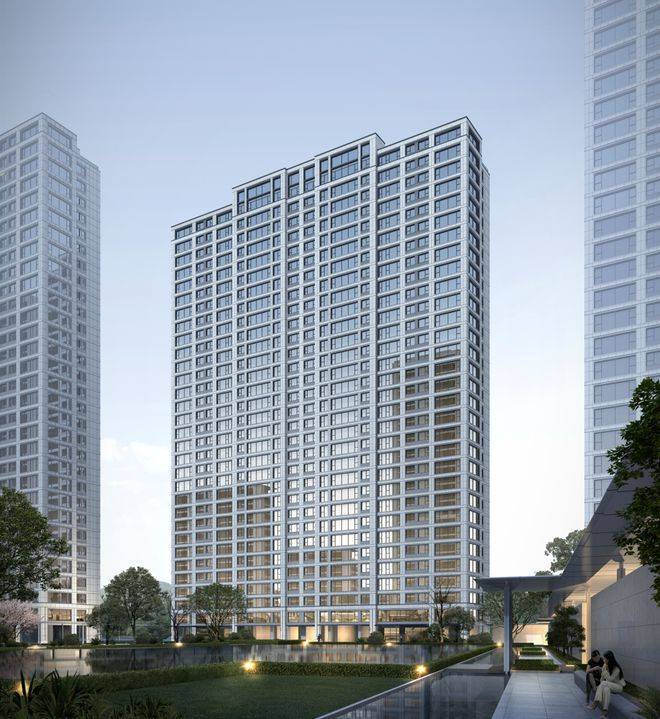 譬如,项目立面让人一眼惊艳:采用全干挂石材+局部铝板+金属线条, 石材的沉稳、铝板的现代与线条的跳跃有机融合,完美呈现出艺术的美学。