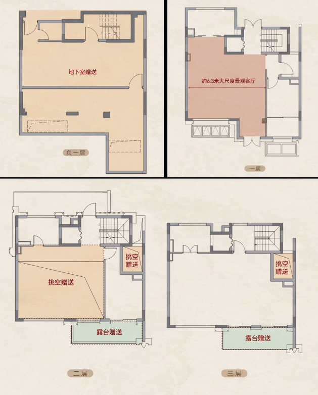④超值赠送,地下室+挑空+3阳台+4露台+花园,🉐使用面积400-450㎡;