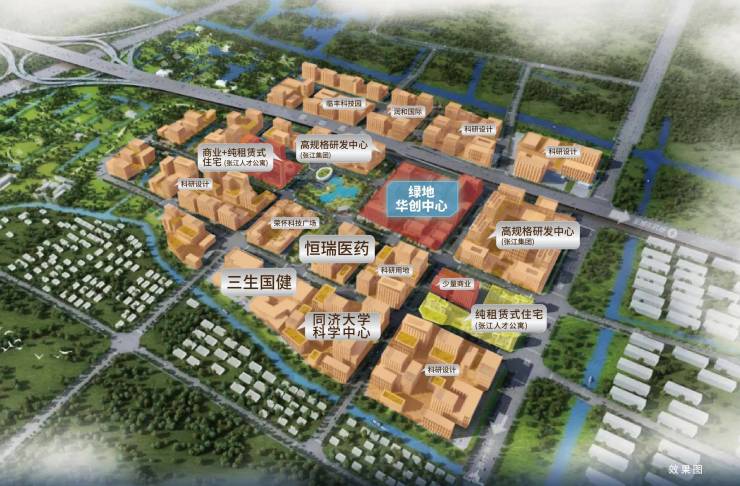 绿地华创中心位于张江高科技产业聚集地-张江总部园核芯区。张江总部园涵盖前端开发、高端制造、商业服务办公等功能,有数十家头部企业、上市公司、独角兽企业聚集。当前恒瑞医药(中国药企top1,全球top 21)、同济大学科学中心(上海市重点项目)、两大高规格研发中心(张江集团)已进驻张江总部园。