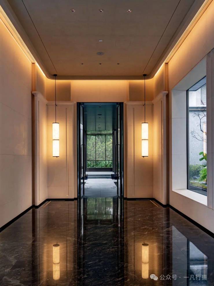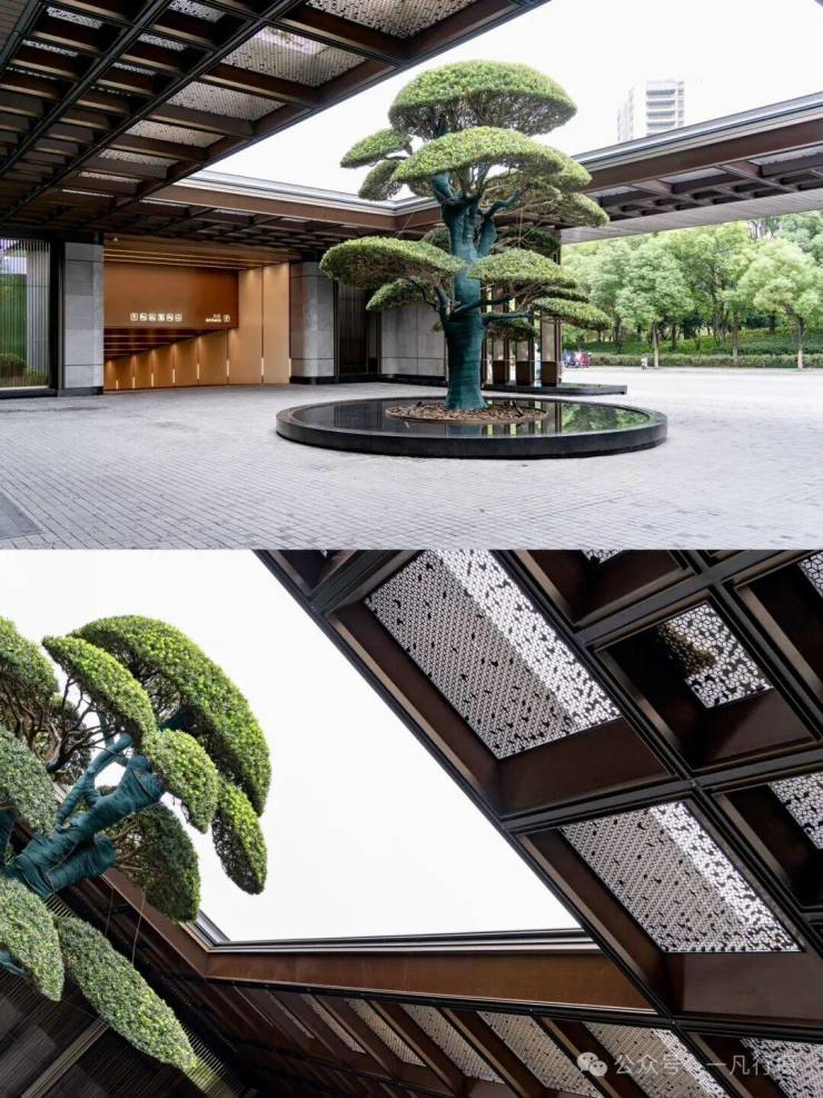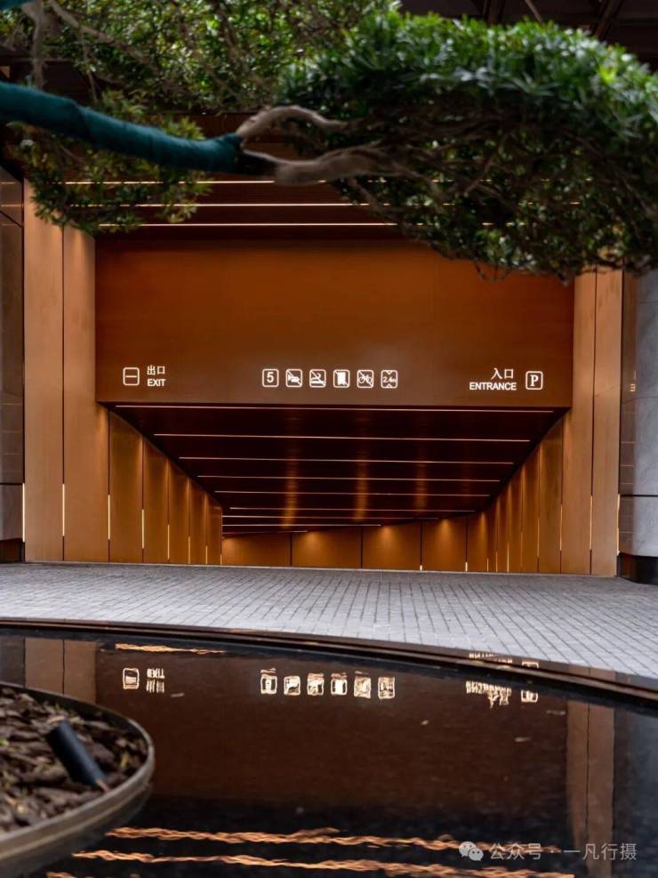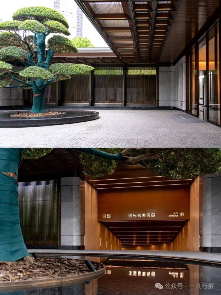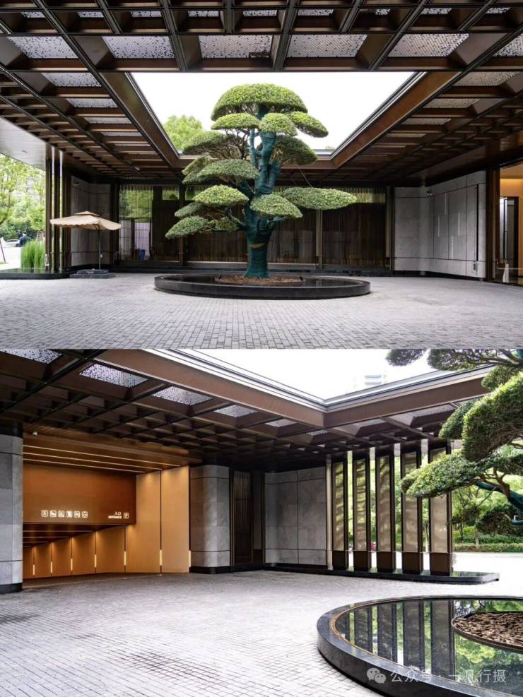 入口门廊古松相迎,倒影水中,含蓄的格栅与天井透露出隐奢意境。阳光从镂空门廊洒下,光影游走,让归家体验,从喧器到宁静实现自然过渡。
