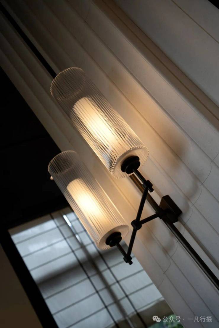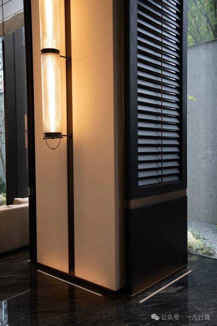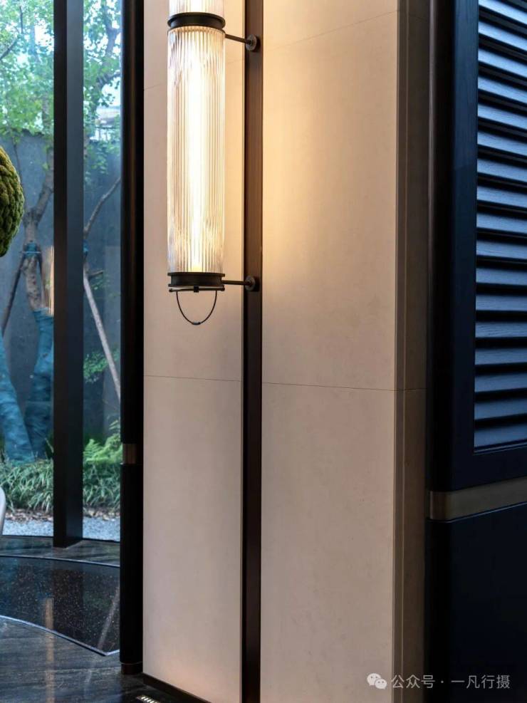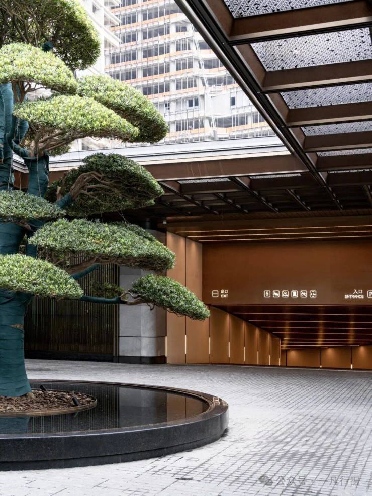 入口门廊古松相迎,倒影水中,含蓄的格栅与天井透露出隐奢意境。阳光从镂空门廊洒下,光影游走,让归家体验,从喧器到宁静实现自然过渡。