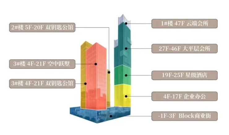 项目总建筑面积约15万方,业态包含星级酒店、Block商业街、总部办公、企业会所、企业办公等,已引入中铁集团、万凯新材等国企、上市公司,带来稳定、高净值商务人群;超高层中区将引入高星级酒店,带来更高规格的服务礼遇和生活享受;项目三层以下和地下一层为约1.8万方block商业街区,满足高品质生活所需。