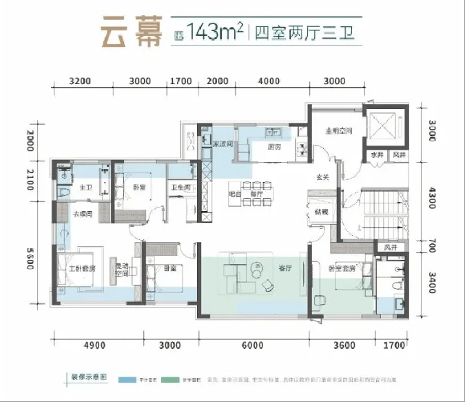 南向4+1开间设计,三卧朝南+三卫全明。南向布局“双套房”,其中主卧小家化设计:南北通透,开间约4.9米,自带衣帽间+独立卫浴+灵动空间。