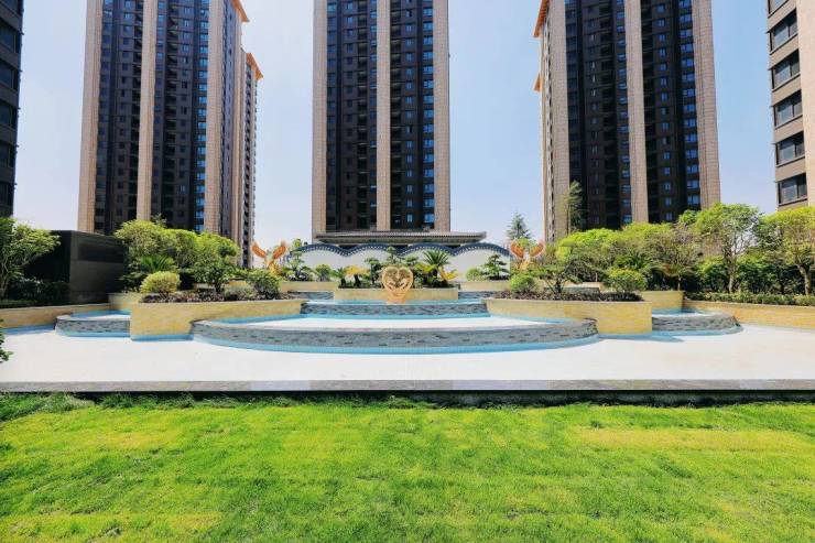 小区内部的新中式山水园林设计与城市绿化自然过渡,设置众多艺术雕塑、景观休闲步道、中央景观层叠式水瀑布等,形成浑然天成的园林景观。