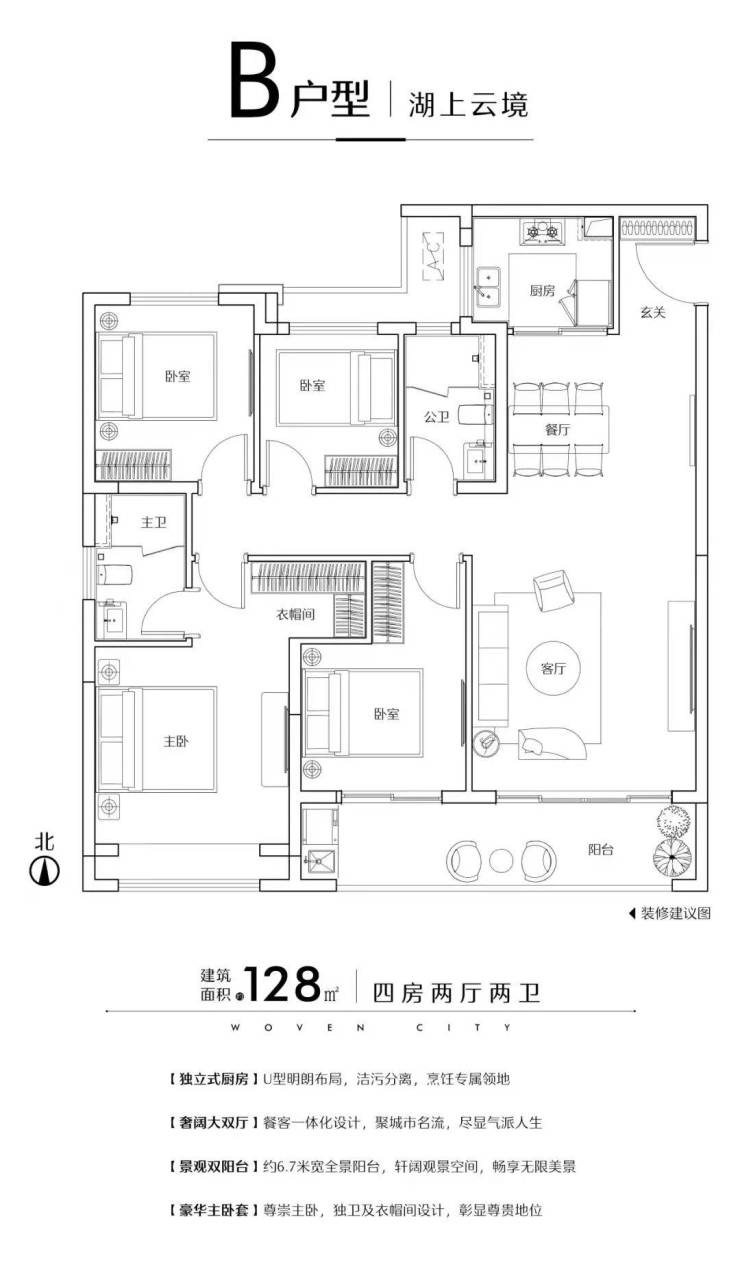 以建筑面积约139㎡为例:“四叶草”设计,让四个卧室格局独立,每位家庭成员都可以享受到无比舒适的起居尺度和私密生活;客餐厅一体化设计,集合了欢聚时光与亲密关系,营造出开放的互动场景;与宽厅自由接洽的跑道式阳台,更打破了空间界限,迎纳风景与阳光入室。