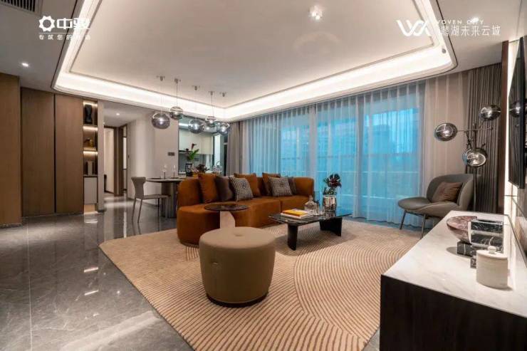 在中骏金辉·未来云城客厅及卧室,梁志天经典造型—三层叠级弧形吊顶装饰天花板,优雅勾勒出高阶生活场域。这项工艺繁复且造价高,耗时为普通吊顶的3倍,常被应用于星级酒店中,足以体现未来云城之用心。
