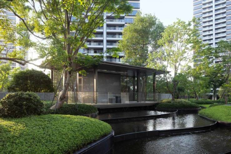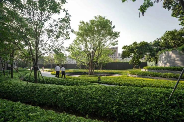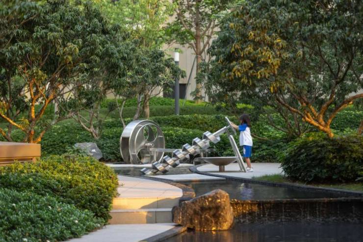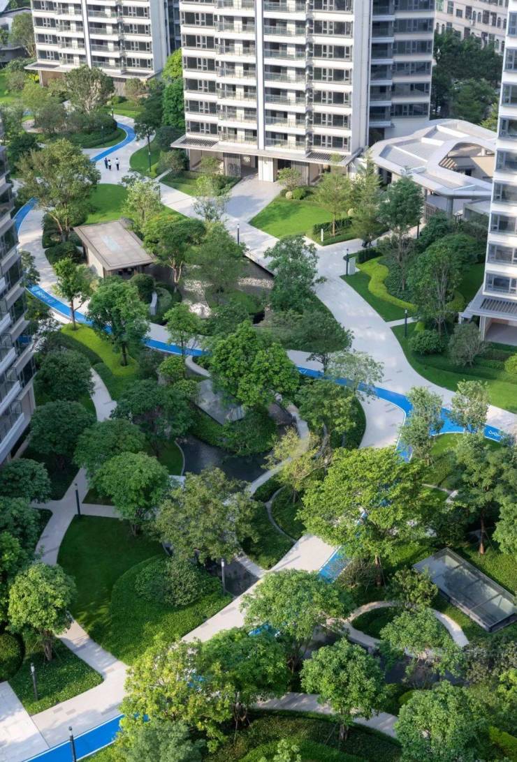 庭院如诗,漫步水系感受流转之美。景观面积宽裕且存在较大高差资源,因此设计通过竖向结合场地纵深与横向尺度,强化空间的开合节奏与空间留白,形成舒朗有致的公园景象。此外在植物设计营造中尽可能以简洁干净的林带式风格为主,减少中层的堆砌与组团,穿插与岭南气候相宜的特色植物搭配。