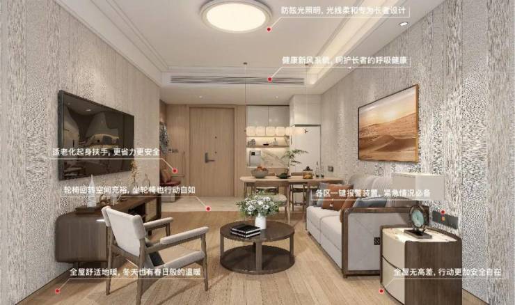 •产权居家养老公寓,医康养融合保障,户型全朝南、大面落地窗设计,恒温恒氧空间,室内紧急报警装置,突发情况紧急救治。