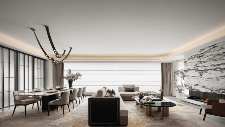 320样板房,以“海派东方”为设计之源,在传统文化与海派精神整体交汇的风格中,融入屏风、雕花、水墨等中式元素,传递东方美学的优雅浓缩。在“空中院落”,或琴棋书画,或诗酒花茶,品味人生八雅之乐;转身之间,约21.4米横向IMAX大面宽,让风景与光线的双重盛宴连绵入目。