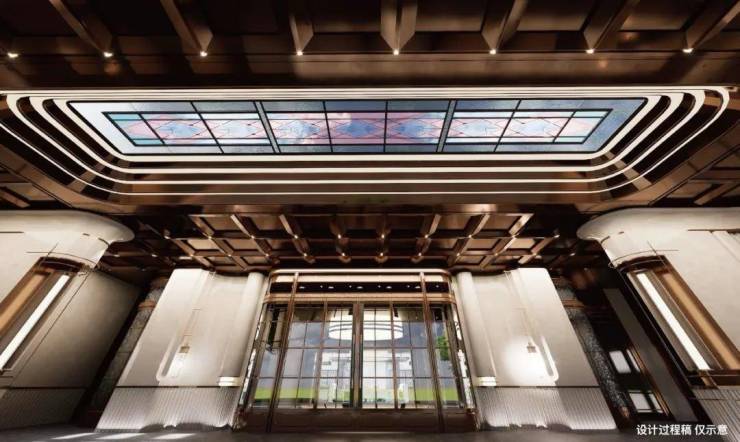 酒店落客区的彩色玻璃穹顶,撷取和平饭店穹顶的经典韵味,融入PRADA荣宅木雕的现代笔触,将天光滤成斑斓画卷,让归家之路步步生辉,谱写一曲浪漫的光影礼赞。